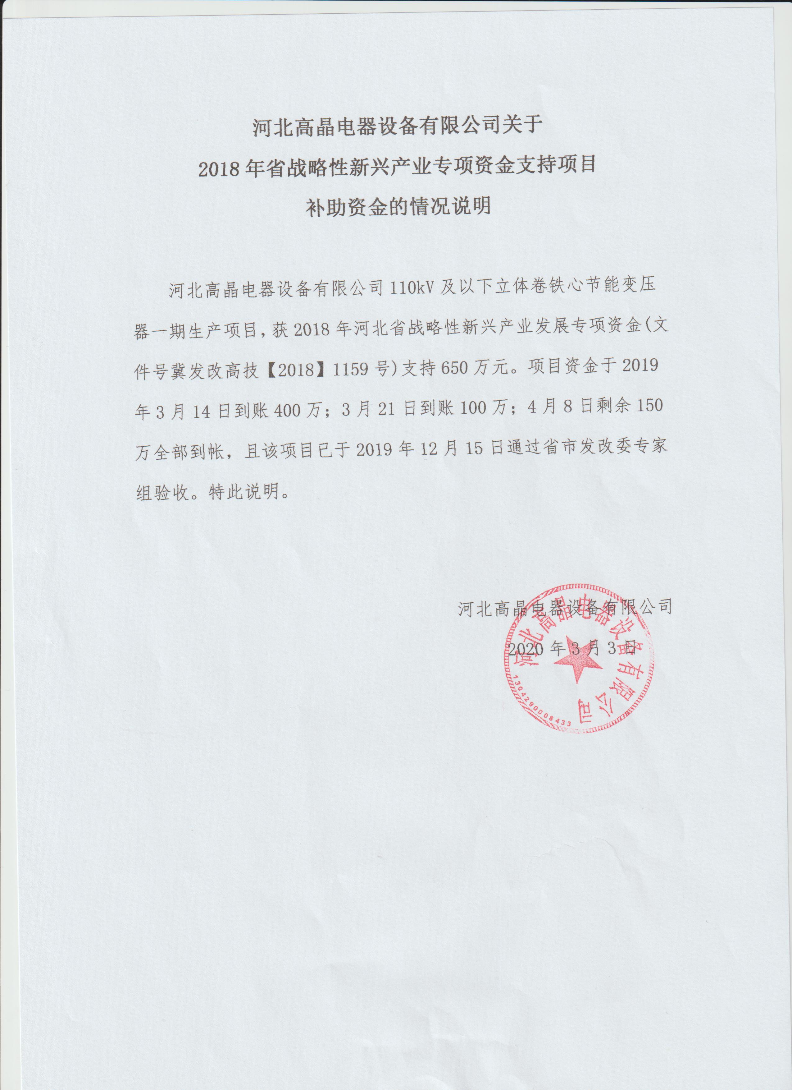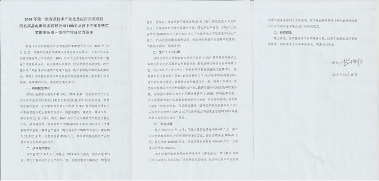 根據(jù)《河北省高技術(shù)產(chǎn)業(yè)發(fā)展項(xiàng)目管理暫行辦法》,2019年12月15日,邯鄲市發(fā)展和改革委員會(huì)在永年區(qū)組織召開了由河北高晶電器設(shè)備有限公司承擔(dān)的110kV及以下立體卷鐵心節(jié)能變壓器一期生產(chǎn)項(xiàng)目(年產(chǎn)2000MVA S13型110kV及以下立體卷鐵心節(jié)能變壓器)驗(yàn)收會(huì)。會(huì)議邀請(qǐng)技術(shù)、經(jīng)濟(jì)專家組成驗(yàn)收組,驗(yàn)收組聽取了項(xiàng)目工程竣工報(bào)告、技術(shù)總結(jié)報(bào)告和財(cái)務(wù)決算報(bào)告,審閱了財(cái)務(wù)專項(xiàng)審計(jì)報(bào)告及有關(guān)驗(yàn)收材料,并考察了項(xiàng)目現(xiàn)場(chǎng)。經(jīng)質(zhì)詢和討論,該項(xiàng)目完成了各項(xiàng)建設(shè)內(nèi)容,達(dá)到了批復(fù)的總體目標(biāo)和要求,同意通過驗(yàn)收。